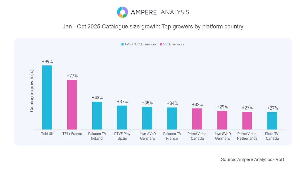 Free ad-supported platforms (AVoD) recorded the fastest global catalogue increase in 2025, exceeding the other video-on-demand (SVoD) platforms.